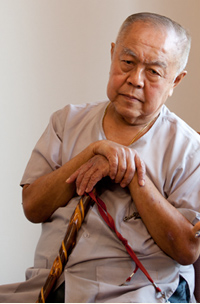 この杖は、数年前にワシントンDCでデモに参加したときに米国人女性からもらったものです。そのとき一緒に歩いた僧侶は、18年間、中国政府の拷問を受けたそうです。彼は私より20歳年上だったのですが、はるかに若く見えました。ですから、私は彼に「どうやって若さを保ったのですか?」と尋ねました。彼は「拷問されたとき、深い呼吸をしていました」と答えたのです。また、彼を拷問している人を許すように祈ったそうです。ようやく彼は釈放され、彼らは友達になりました。